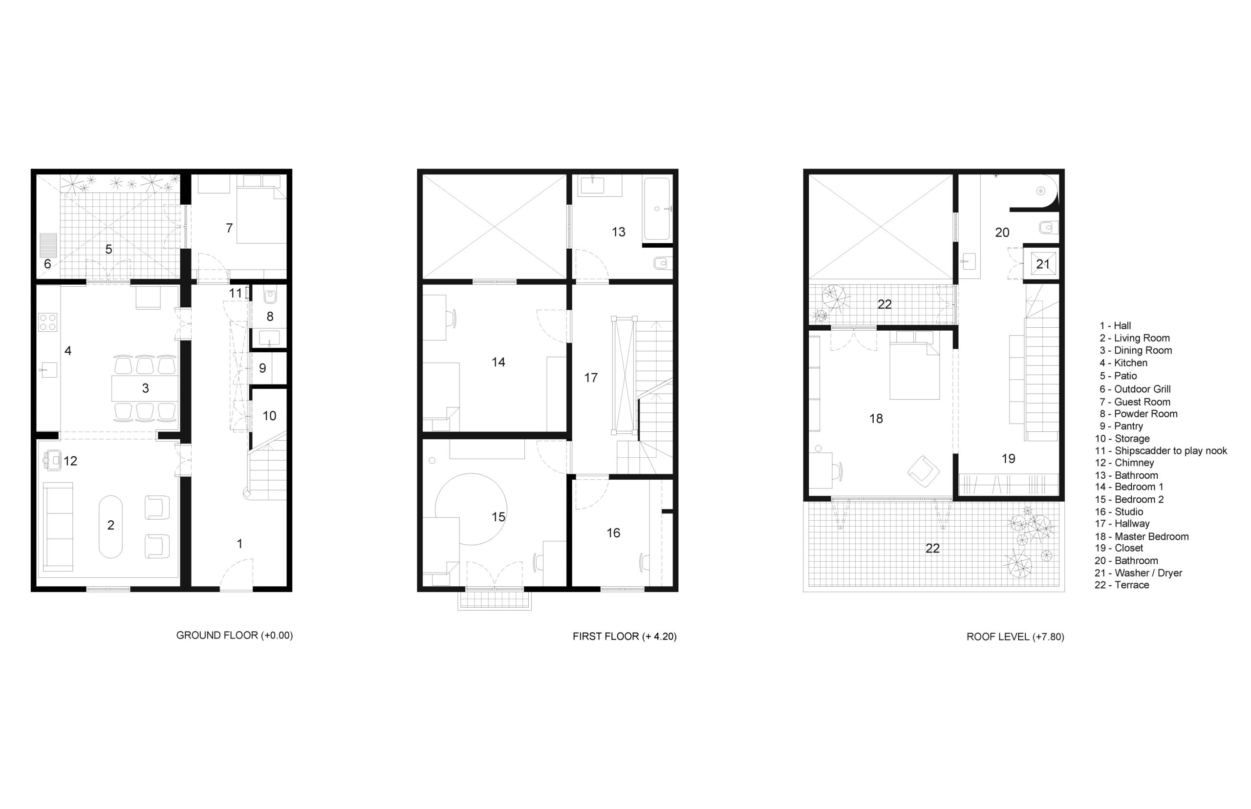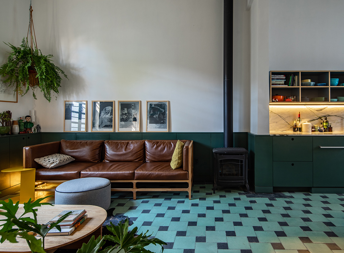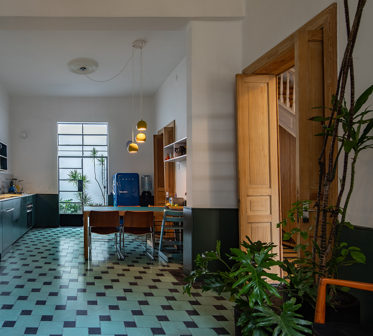 Remodelación de una casa de 1910 en la Colonia Roma de la Ciudad de México. Si bien la casa se ubica en un terreno pequeño (solo 7 metros de frente y 12 metros de fondo), la generosa altura de los techos (3.80 cm en la planta baja) le da una sensación de amplitud y amplitud. La audaz elección de colores y materiales, como los azulejos de cemento verde y negro en la planta baja, conecta la casa con su historia y contexto.